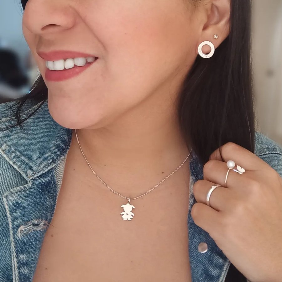 Cadena en plata 925 y dije en forma de niña con corazón calado elaborado en plata 950. Largo de cadena:45 cms Medida de dije: 1.8 cm