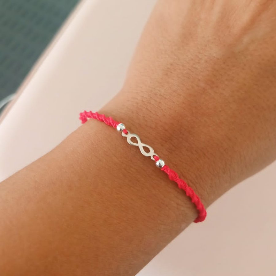 Pack de pulseras regulables, tejidas en color rojo y negro con detalle de dije en forma de infinito.