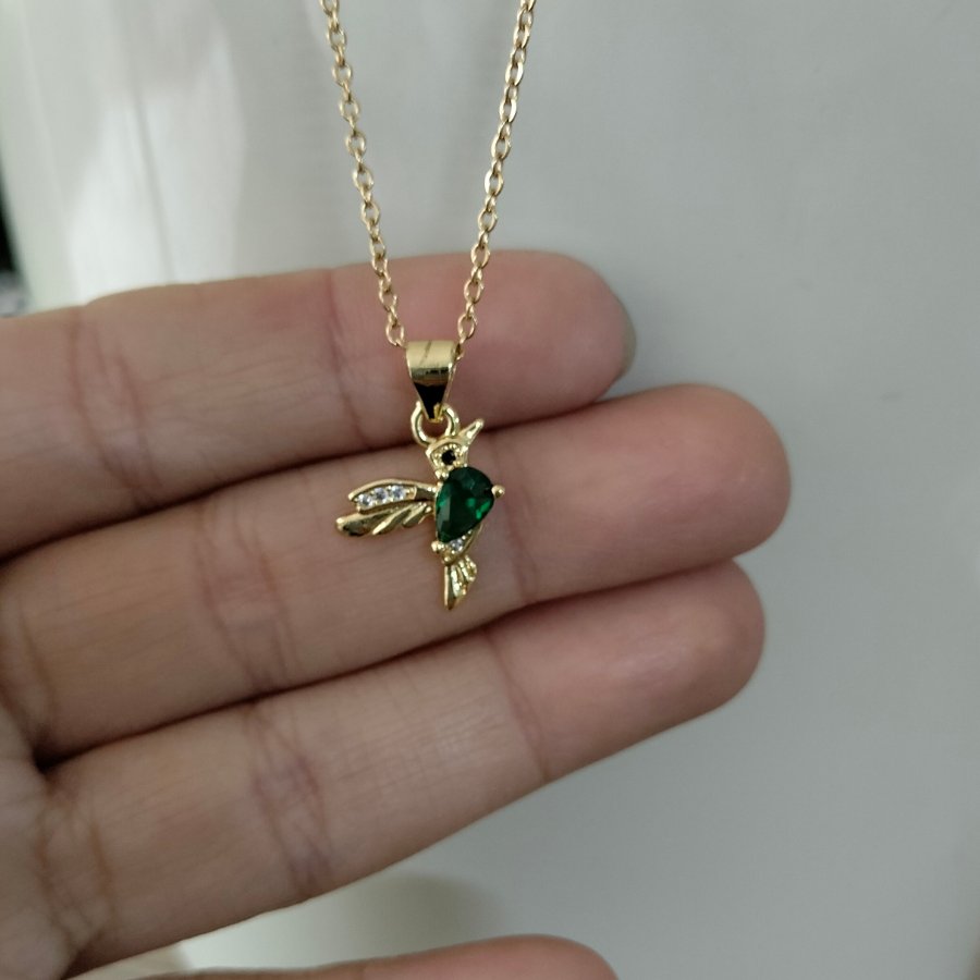 Collar en acero y dije en cobre en forma de colibrí, lleva detalle de piedrita color esmeralda.