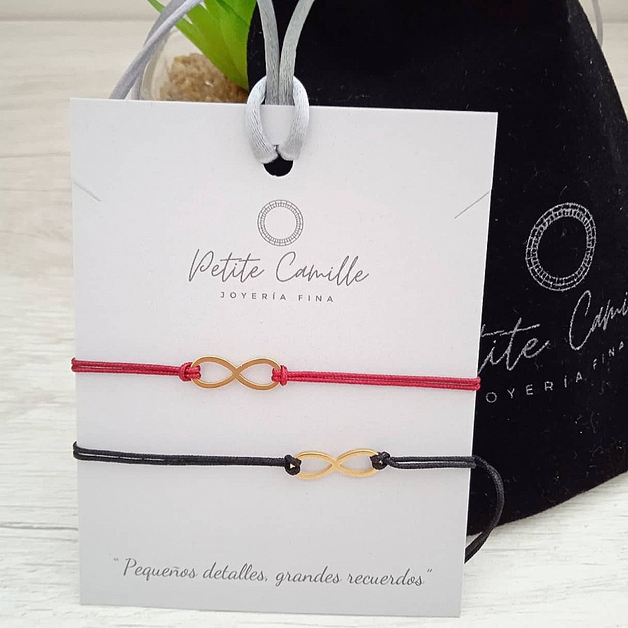 Pack de pulseras regulables, tejidas en color rojo y negro con detalle de dije en forma de infinito, en acero bañado en oro
